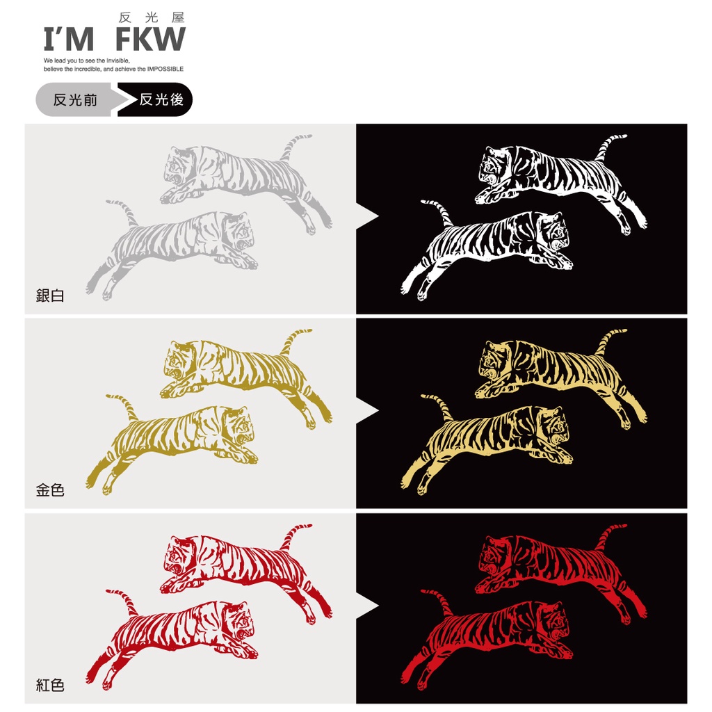 躍虎反光貼紙,猛虎出閘,跳躍出擊,採用HHR專利技術網版印刷製作,貼紙具有防水、耐曬、高亮度反光等特性,非常適合作為車貼使用。