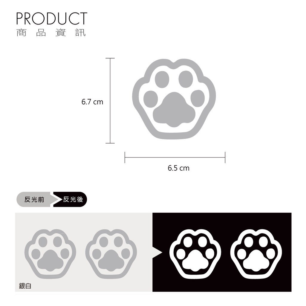 貓咪可愛腳印反光貼紙,一組就包含兩張貓掌。採用HHR專利技術網版印刷製作,貼紙具有防水、耐曬、高亮度反光等特性,非常適合作為車貼使用。