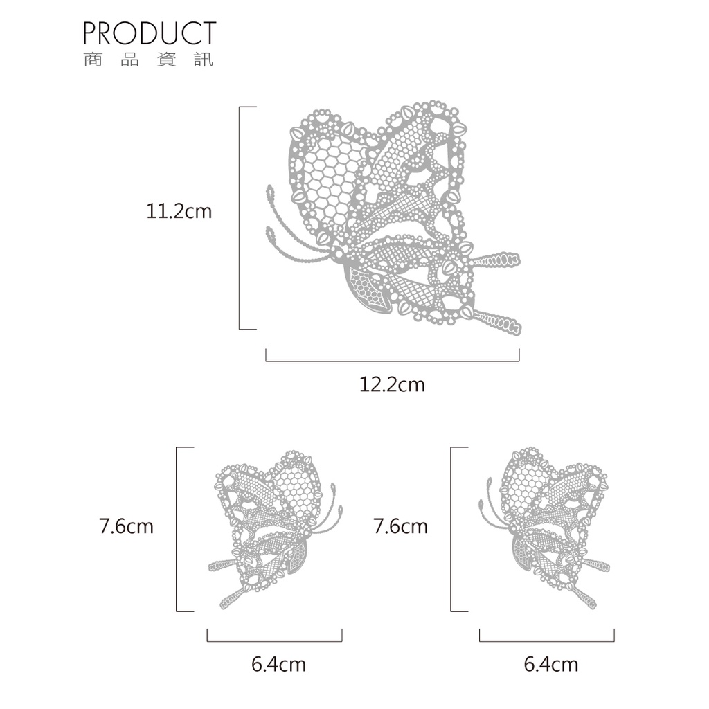 蝴蝶元素反光貼紙,以蕾絲造型點綴蝴蝶外型,簍空細節更加精緻。採用HHR專利技術網版印刷製作,貼紙具有防水、耐曬、高亮度反光等特性,非常適合作為車貼使用。