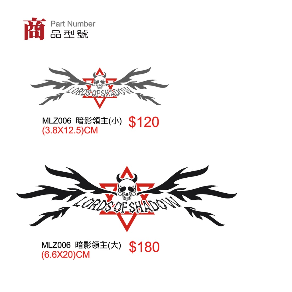 暗影領主反光貼紙,兩種尺寸,增加你的惡魔暗黑感!採用HHR專利技術網版印刷製作,貼紙具有防水、耐曬、高亮度反光等特性,非常適合作為車貼使用。