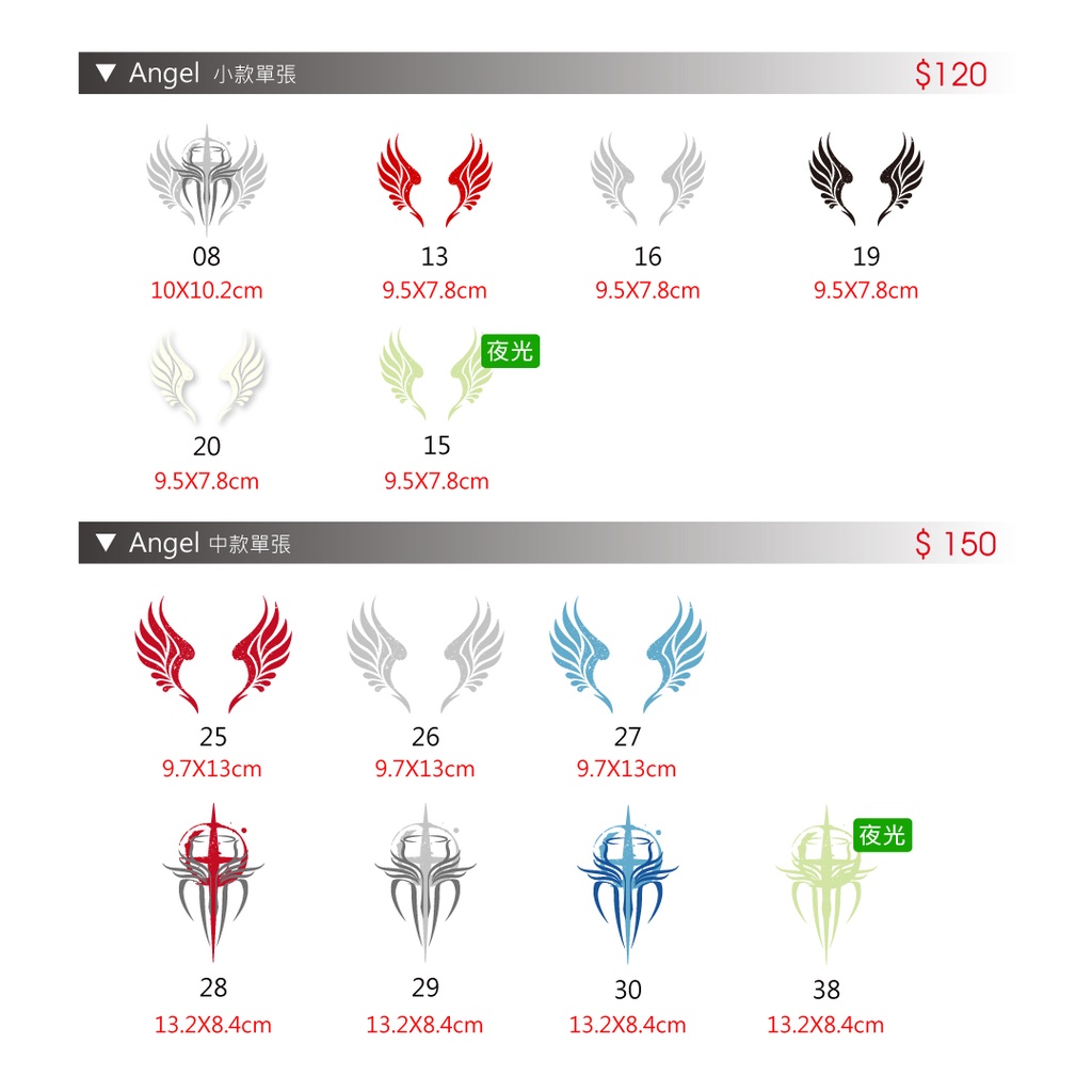 ANGEL反光貼紙系列,翅膀破損元素,反光屋的經典車貼,系列包含多種尺寸、圖樣、顏色可選擇,採用HHR專利技術網版印刷製作,貼紙具有防水、耐曬、高亮度反光等特性,非常適合作為車貼使用。