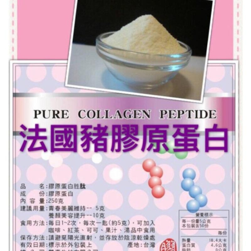 妳的日常,值得更美好的儀式感 法國女人的優雅,不在浮誇,而在日常的細節。 每天一小匙,讓膠原蛋白融入妳的生活,像保養一樣自然,像呼吸一樣輕鬆。 沒有鋪張的廣告,沒有高價的代言, 我們堅持把資源放在 純淨品質, 因為妳值得花最少的錢,得到最真的美麗。 🔬 分子量僅 2000 Da → 胜肽等級,快速吸收 🔬 特殊水解技術 → 幾乎無腥味,口感佳 🔬 每日建議 5 公克 → 實驗證實可長期補充 🔬 無額外負擔 → 無多餘添加,專注有效成分 👛👉成份:法國豬膠原蛋白250克 吃的膠原蛋白用量:一天食用5~10g(可搭配牛奶沖泡、加入果汁或直接食用) ※素食者請勿使用 早餐:可以搭配在豆漿、牛奶、麥片中~ 午餐:加在熱湯中~吃個火鍋也可以變成膠原蛋白鍋~~ 下午茶:咖啡、珍珠奶茶、紅茶、綠茶…都可以加喔~~ 晚餐:熱湯、飲料~ 也可製成化妝水、精華露,還可以用來敷臉喔~~ 分子量:2000道爾頓之間 👙適用對象:適合各年齡層,孕婦及哺乳中的媽媽 膠原蛋白化妝水、面膜、精華液: 化妝水:膠原蛋白與水的比例約1:10,可與純水DIY成化妝水每日使用。 面膜、精華液:膠原蛋白與水比例約1:5,可與純水或化妝水攪拌製成精華液,取乾淨面膜吸收膠原蛋白精華液之後敷於臉上,此時皮膚已經開始吸收膠原蛋白,約10~15分鐘取下面膜,完成後可讓膠原蛋白精華液持續留在臉上吸收,達到最大效益,或也可用水洗淨全臉(依個人喜好而定)。 保存方法:請放置乾燥陰涼處,以避免受潮 本產品已投保$1,000萬元責任險,保障消費者,食用更安心