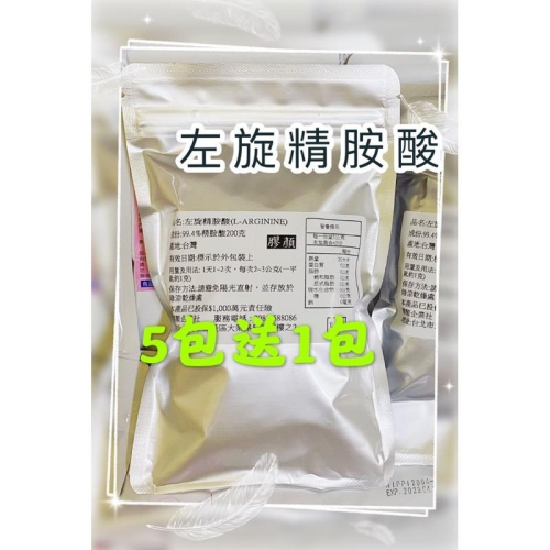 買5包送1包 品名:左旋精胺酸 成份:左旋精胺酸 使用方法:1天1~2次,每次2~3公克 包裝方式:每包200克裝 保存方法:請放置乾燥陰涼處 人體內在生成的一氧化氮小分子, 可到達人體所有部位,有傳輸信號的功能, 是促進身體健康的重要元素。 本產品已投保$1,000萬元責任險,保障消費者,食用更安心 如有其他問題可參考關於我或在問與答問我喔~~^_^