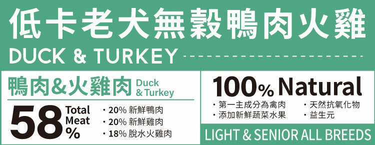 新鮮鴨肉 20%、新鮮雞肉 20%、脫水火雞肉 18%、豌豆仁、馬鈴薯、豌豆澱粉、甜菜漿、脫水雞肉蛋白、雞油、水解雞肝、新鮮水果蔬菜 4%(蘑菇、蔓越莓、芒果、蘋果)、植物纖維 1%(木質素、不可溶天然纖維)、鮭魚油(Omega-3與Omega-6 來源)、礦物質、關節保健配方(硫酸軟骨素、葡萄糖胺硫酸鹽和MSM)、左旋肉鹼 0.1%、絲蘭萃取物、菊苣根(菊粉-FOS 來源)、酵母(MOS)、香草(迷迭香、百里香和牛至)