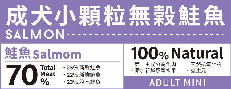 新鮮鮭魚 25%、新鮮鯡魚 22%、脫水鮭魚 23%、豌豆仁、馬鈴薯、雞油、豌豆澱粉、甜菜漿、水解鮭魚、水果蔬菜 4%(菠菜、胡蘿蔔、蘋果)、長角豆(纖維來源)、鮭魚油(Omega-3 和 Omega-6 來源)、植物纖維(木質素)、礦物質、關節保健配方(硫酸軟骨素、葡萄糖胺硫酸鹽和MSM)、絲蘭萃取物、菊苣根(菊粉-FOS 來源)、酵母(MOS)、香草(迷迭香、百里香和牛至)
