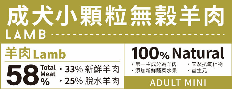 新鮮羊肉 33%、脫水羊肉 25%、豌豆仁、馬鈴薯、雞油、甜菜漿、水解羊肝、新鮮水果蔬菜 4%(青豆、蘋果)、長角豆、鮭魚油(Omega-3 和 Omega-6 來源)、礦物質、關節保健配方(硫酸軟骨素、葡萄糖胺硫酸鹽和MSM)、絲蘭萃取物、菊苣根(菊粉-FOS 來源)、酵母(MOS)、香草(迷迭香、百里香和牛至)