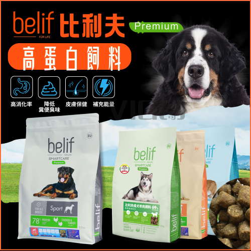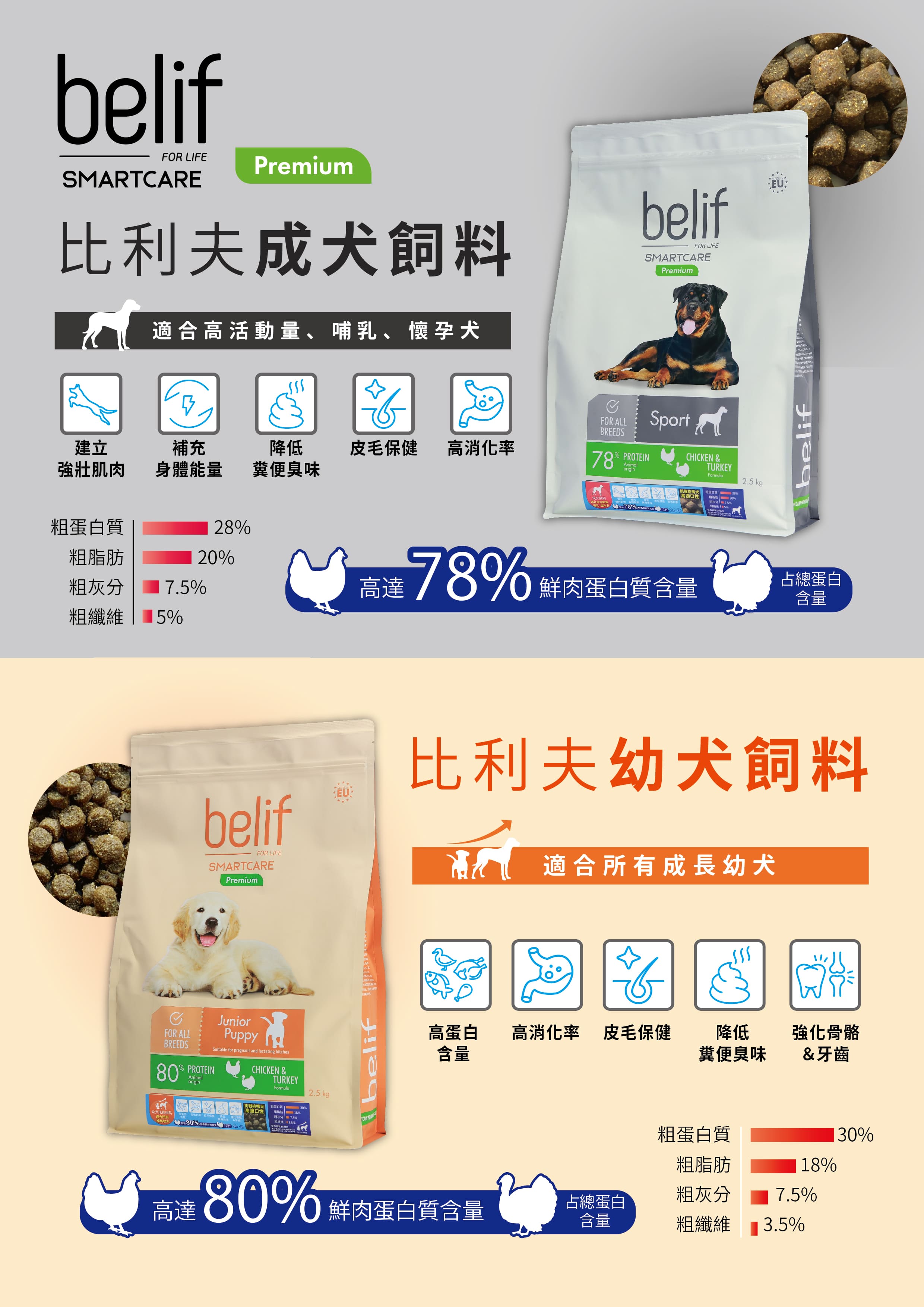 比利夫 (belif) 犬飼料是來自立陶宛的歐洲進口品牌,主打高品質肉類蛋白,常見配方包含幼犬、成犬、腸胃敏感(羊肉)及皮毛保健(鮭魚)等,並有 2.5kg、12kg 至 18kg 等不同包裝。該品牌飼料強調在歐洲製造,適口性佳,適合不同年齡與特殊需求的狗狗