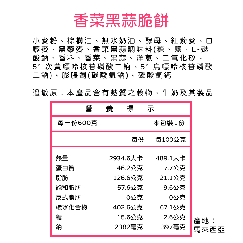 • 香菜黑蒜脆餅 600g 約25~29包 香菜黑蒜脆餅 600g 約25~29包