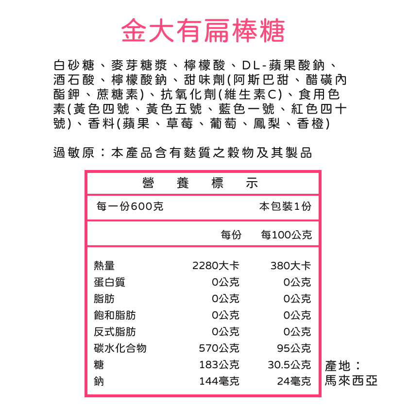 金大有扁棒糖 扁型棒棒糖 水果扁糖 扁平棒棒糖 水果口味 草莓口味 葡萄口味 橘子口味 蘋果口味 鳳梨口味