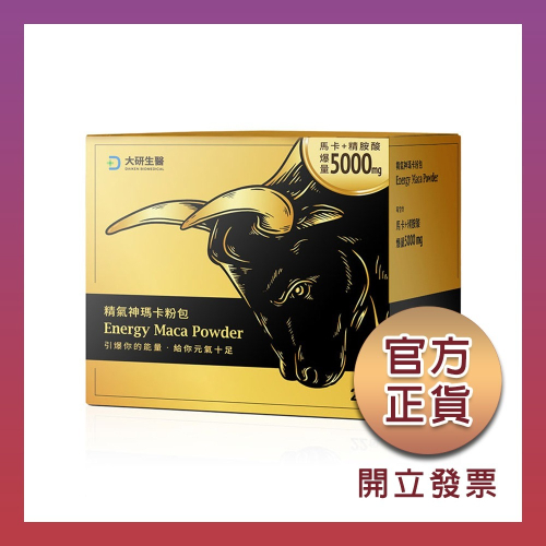 【商品品名】大研精氣神瑪卡粉包 【商品規格】22包/盒 【商品重量】7.4g/包 【內容物成分】馬卡粉、L-精胺酸、檸檬酸鈉、香料、DL-蘋果酸、檸檬酸鈉、葡萄糖酸鋅、蔗糖素(甜味劑)、醋磺內酯鉀(甜味劑)、西伯利亞人參(含西伯利亞人參萃取物、麥芽糊精)、蛹蟲草子實體粉末(Cordyceps militaris, 固態培養)、透納葉萃取粉末(含透納葉萃取粉、糊精)。 【劑型】粉包 【食用方式】每日1~2包,可直接到入口中食用或沖泡於150ml的常溫水拌勻食用。一日請勿超過2包,多食無益。 【保存方式】請置於室溫,陰涼乾燥處,避免陽光直射,開封後請儘速食用。 【原產地】台灣 【貨源】公司貨 【有效日期】保存期限3年,依包裝所示 【投保產品責任險字號】新光產物產品責任險保單號碼130007AKP0000933 *本產品投保新光產物新台幣一億元產品責任險*投保金額不等同理賠金額 ※ 製造日期與有效期限,商品成分與適用注意事項皆標示於包裝或產品中。 ※ 本產品網頁因拍攝關係,圖檔略有差異,實際以廠商出貨為主。 ※ 本產品文案若有變動敬請參照實際商品為準。 ************* 使用美國亞馬遜熱銷天然所瑪卡(2500mg) 調節生理機能,給您精‧氣‧神 廣受男性Youtuber熱情推薦 ✔︎高單位馬卡和左旋精胺酸讓你活力充沛、增加體能 ✔︎添加刺五加、透納葉、蛹蟲草,可調整體質、滋補強身! ✔︎鋅有助於維持生長發育與生殖機能 ✔︎6 in 1 能量複方給您元氣十足神表現 💡市面上瑪卡百百種,大研給您最完美的6大配方比例,引出您的能量潛能💡 ①瑪卡2500mg__足量添加,調節生理機能,給您精氣神 美國TERRASOUL®原廠六倍濃縮馬卡 ☆ 美國亞馬遜本草類保健品熱銷排行第一名! ☆ 6:1比例超強濃縮馬卡,無市面上澱粉灌水 ☆ 100% 秘魯安第斯山脈高原種植,非市面上中國大陸劣質品 ☆ 馬卡根經過挑選、以40%黃馬卡、30%紅馬卡、20%黑馬卡、10%紫馬卡比例混合 ②左旋精胺酸2500mg__一氧化氮的前驅物,讓您活力充沛,增加體能 ☆ 精胺酸為一種珍貴的「胺基酸補充劑」,存在於牛肉、堅果、蛋等食物中 ☆ 身體本身亦可自行製造,但人體合成量有限,常常無法達到基本需求量,必須從食物或其他外來管道攝取 ☆ 大研精氣神瑪卡能量飲的左旋精胺酸,是極純質的胺基酸,不必經過消化,易於人體吸收! ③西伯利亞人參(刺五加)__有氧老虎,補氣之王 ☆其內含有維生素A、B1、B2及C等維生素,以及10多種礦物質成份 ☆豐富的葡萄糖、半乳糖、胡蘿蔔素。 ☆另外有芝麻脂素、木栓酮、皂甘、真皮素、刺五加甘、非芳香性不飽和有機酸等豐富物質 ④蛹蟲草子實體__滋補強身、增強體力 ☆蘊含蟲草素、蟲草酸、蟲草多醣體、12 種維生素、17種以上之微量元素及18種胺基酸 ☆包含人體無法自行合成且必需攝取的8種胺基酸等100種以上的營養 ☆其胺基酸及微量元素含量比冬蟲夏草含量高出許多 ⑤透納葉__活力再現,活躍青春 ☆德國來源,榮獲歐盟、世界等五大專利認證,專業數據支持滋補『強』身必備聖品 ⑥葡萄糖酸鋅__人體必需微量元素 ☆有助於維持能量、醣 類、蛋白質與核酸的正常代謝 ☆有助於維持生長發育與 生殖機能。 完整檢驗報告👍👍👍經過第三方公證單位SGS檢驗通過 推薦給 👤想要和另一伴幸福加分的你 👤想要有源源不絕精力的你 👤想要運動表現更好的你 👤希望保有持久力的你