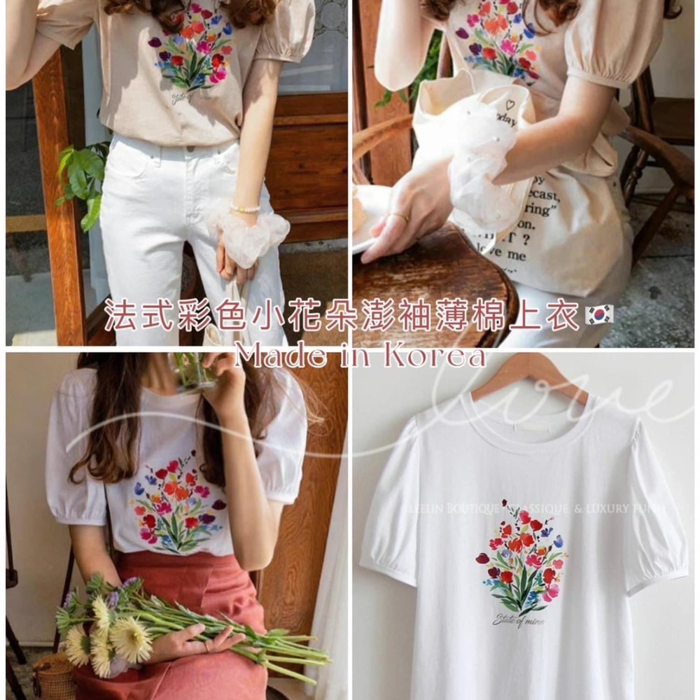 預購 正韓 法式彩色小花朵澎袖薄棉上衣-06/25截止