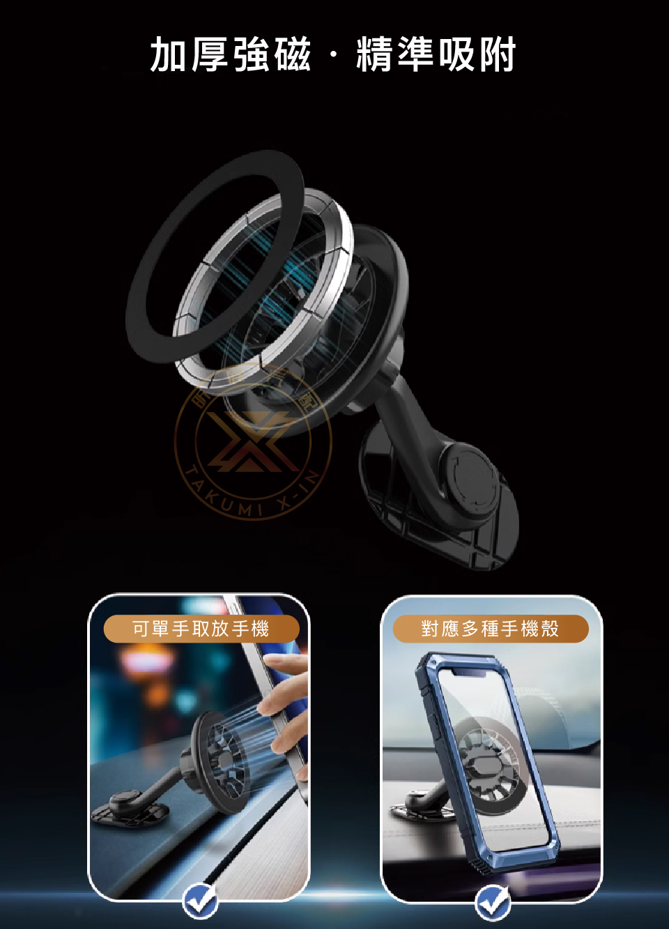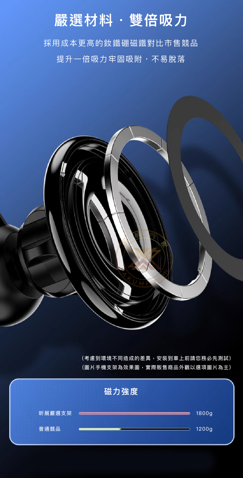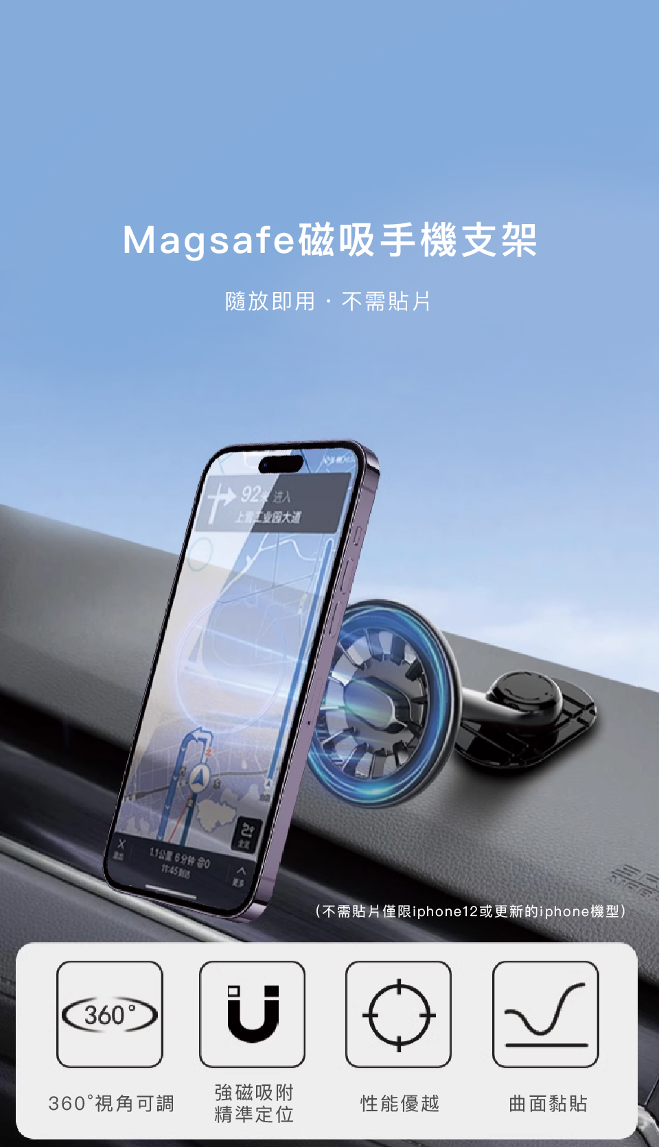 - 使用此手機支架請先理解Magsafe規格,建議先利用家裡的Magsafe無線充電盤測試,確認您的手機殼或貼膜保護背板等保護裝置,可對應最大吸力