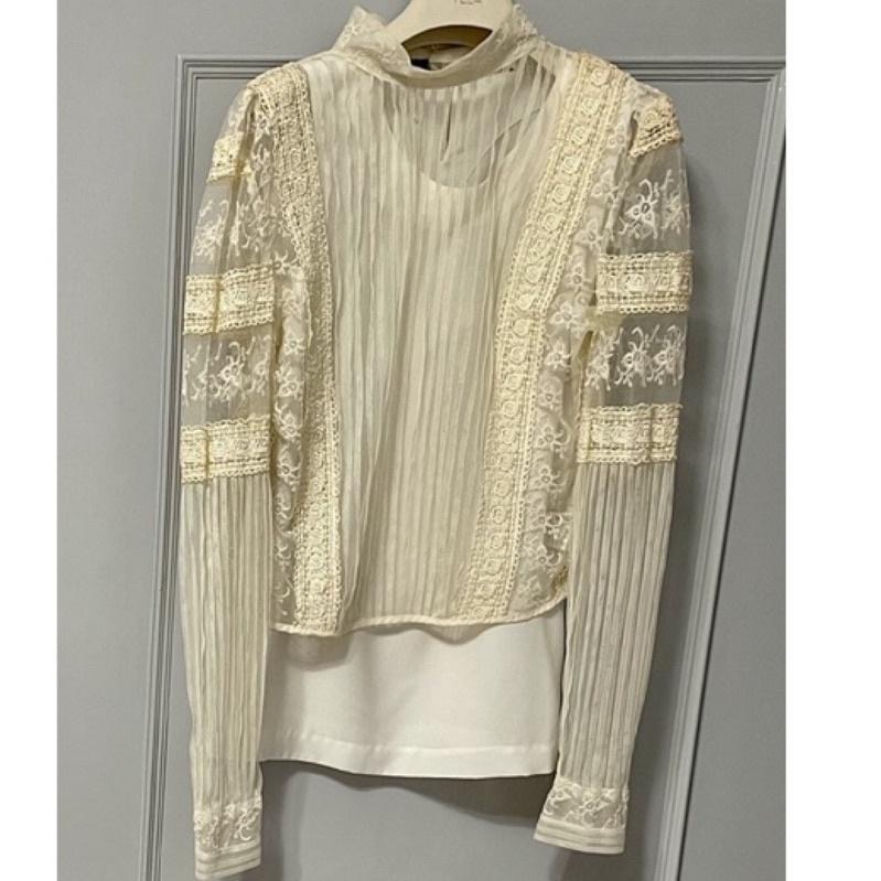 1⃣️義大利製遠企LOVE SEX MONEY氣質復古高領全鏤空蕾絲刺繡玫瑰襯衫2⃣️ 100%純羊毛台灣手工蘇格蘭裙子