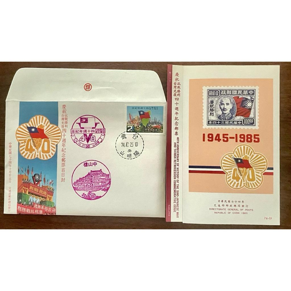 紀210 慶祝抗戰勝利台灣光復四十週年紀念 2全郵票+護票卡+首日封+3枚絕版戳