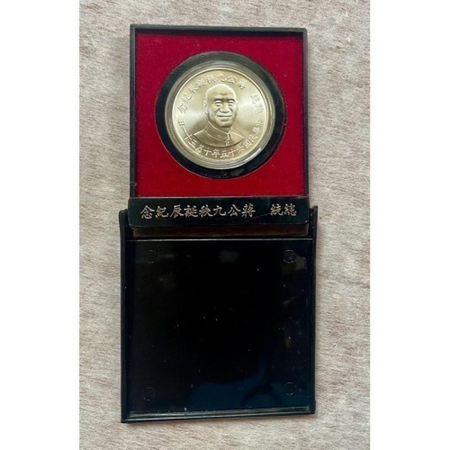 這枚銀幣保存極為完好,表面光澤自然、細節清晰,附完整原廠精美紅絨壓克力展示盒(黑殼紅絨內襯),盒底鑲嵌金色刻字「蔣公九秩誕辰紀念 總統」,整體包裝原汁原味,近半世紀來未經拆封或大幅把玩,品相上乘。