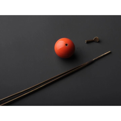 材質尊貴:簪身頂端鑲嵌著一顆渾圓飽滿、直徑約 1.5 公分的橘色 MOMO 珊瑚色老琉璃。這種老琉璃的色澤精準模擬了珍貴 MOMO 珊瑚的溫潤橘紅色調,散發出獨特的年代感與光澤。在日本傳統工藝中,此種色彩一直被視為吉祥與富貴的象徵。