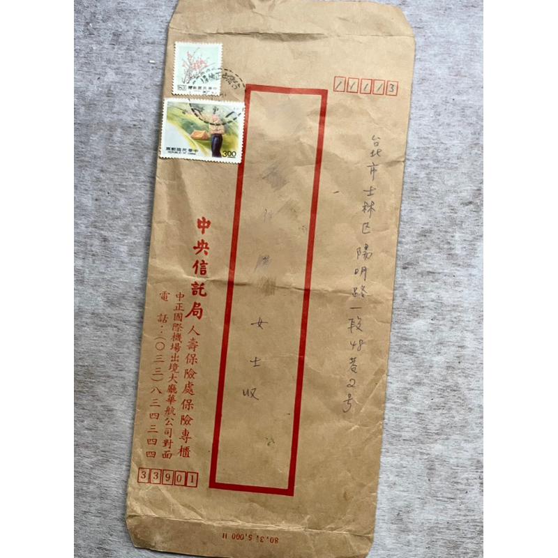 絕版1991年手寫旅遊平安保險單+民國80年戶外活動郵票+ 72年梅花郵票+信封台灣中正機場戳士林陽明山戊戳 民國72年:中央信託局人壽保險業務以「中央人壽」為商標名稱。 民國96年7月:臺灣銀行與中央信託局合併,中央信託局人壽保險處更名為「臺灣銀行股份有限公司人壽保險部」 中正國際機場也改名了 郵戳也當然沒有了