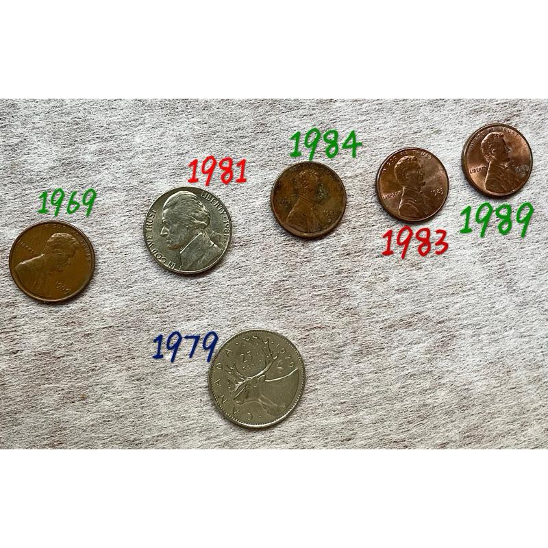 美金加拿大美元硬幣:1969、1983、1984、1989一美分、1分;1981五美分、5分;1979 加拿大 25分