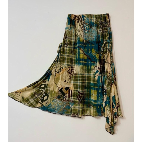 年代與設計: 來自1980年代亞洲時尚中心香港的經典設計與製造。 代理進口: 經由台灣中中服飾有限公司代理進口,品質可靠。 【產品特點】 🎨 獨特配色與材質: 藍綠、咖啡色交織的抽象圖案與格紋設計,色彩豐富而協調,展現不凡品味。 布料觸感柔滑,質感非凡,穿著感受極致舒適。 🧵 實穿與細節: 鬆緊裙頭設計,穿脫方便,適用多種身形。 飄逸裙擺與獨特設計圖案,讓您輕鬆展現獨一無二的氣質優雅。 【搭配建議】 多種搭配可能,適合各種場合! 無論是搭配素色上衣展現復古文藝氣息,或是搭配短版上衣營造時尚混搭風格,都能讓您成為焦點。 【珍藏提醒】 古著逸品,僅此一件! 錯過不再有,立即行動將這份優雅帶回家! 請注意: 二手古著商品難免有歲月痕跡,完美主義者請三思。