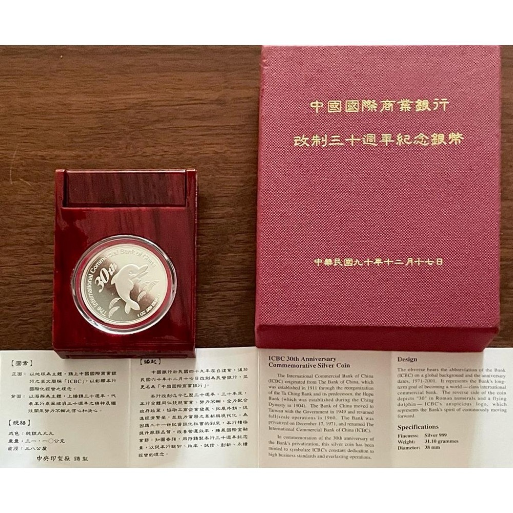 這枚一盎司純銀紀念幣見證了台灣金融史上的重要時刻——中國國際商業銀行(ICBC)改制30週年紀念。發行於民國90年12月17日,記錄了銀行從1971年至2001年的輝煌歷程。 ✨ 商品特色 🐬 經典設計 正面:可愛的海豚圖案搭配愛心Logo,象徵銀行不斷前進與關懷客戶的精神 背面:中國國際商業銀行30週年紀念標誌 材質:純銀999 重量:31.10公克(1盎司) 直徑:38mm 📦 完整配件 ✅ 原廠精美紅色絨面收藏盒 ✅ 官方保證書(中央印製廠印製) ✅ 透明保護殼 ✅ 品相完美,保存良好 💎 為什麼值得收藏? 雙重絕版價值 中國國際商業銀行已併入兆豐銀行,原行已不存在 發行數量有限,市場流通量稀少 歷史意義重大 見證台灣金融業發展的重要里程碑 紀念銀行改制的特殊時刻 精緻工藝 中央印製廠精工製作 純銀999高純度材質 設計優美,具藝術價值 投資保值 貴金屬保值特性 絕版收藏品增值潛力 完整配件提升收藏價值 📌 商品狀況 品相:近全新 保存:原裝盒裝,附完整保證書 稀有度:⭐⭐⭐⭐⭐ #絕版銀幣 #紀念幣收藏 #中國國際商業銀行 #純銀999 #金融歷史 #限量收藏 #投資理財