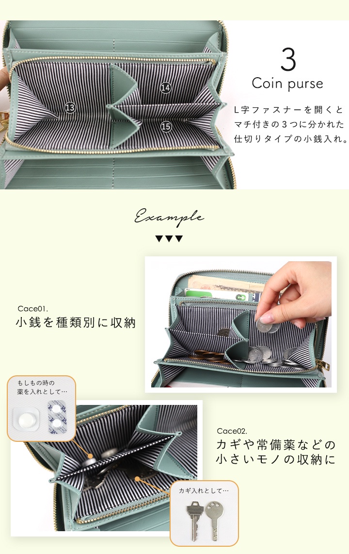 內部:卡片層x 12,開放式夾層x 4、零錢層 ×3