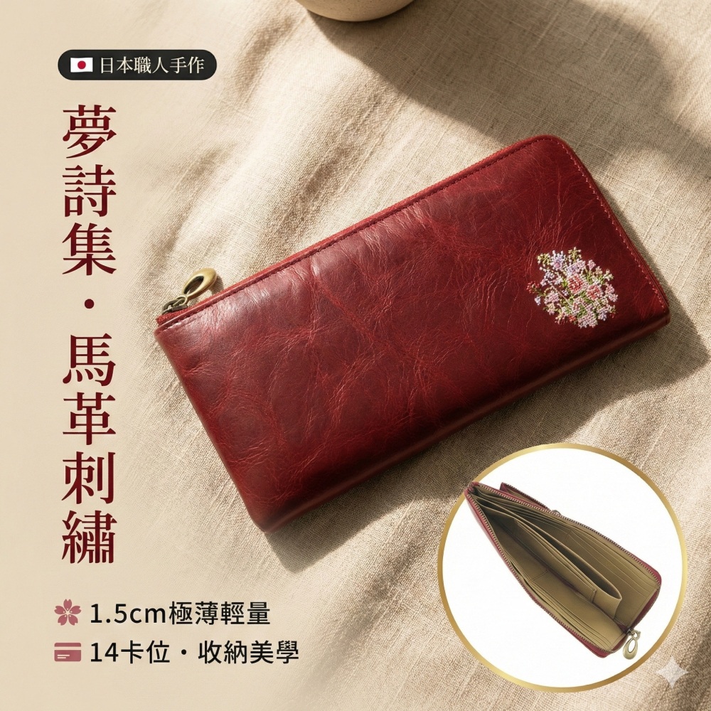 🌸 夢詩集系列・日本手工刺繡馬皮長夾 🌸
