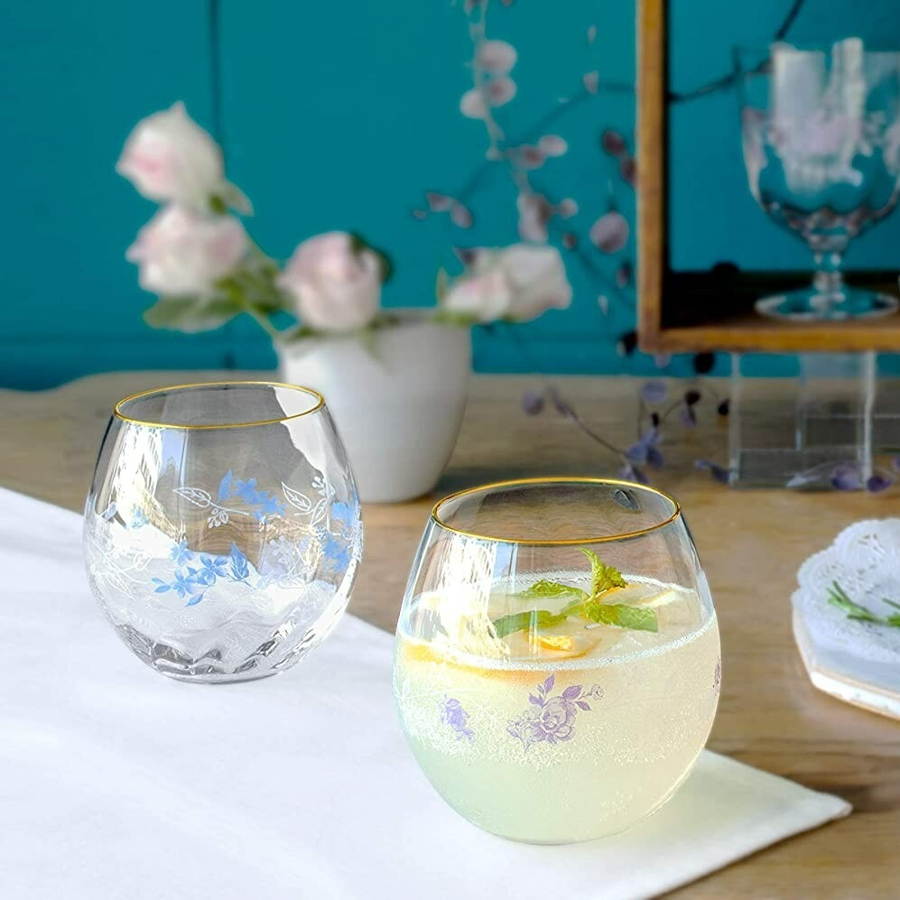 說明:古董風格的玻璃杯上裝飾著藍星和玫瑰,自古以來在歐洲受到人們的喜愛,它的古典氣息,將為您的餐桌增添一抹色彩。
