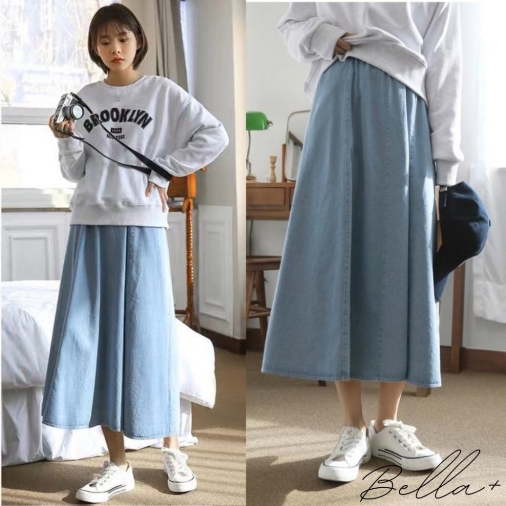 BELLA+台灣現貨秒出🆕大口袋日系牛仔高腰寬鬆半身裙鬆緊腰丹寧長裙休閒百搭新款女A字裙顯瘦復古傘裙垂感大擺裙設計感