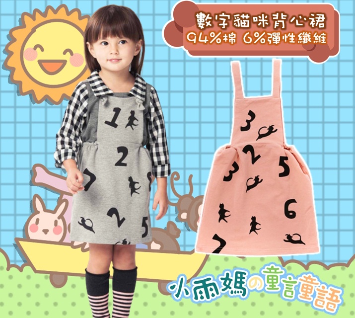 為女童設計的背心裙款式,整件用數字和貓咪圖案印製的背心裙款式,讓寶貝搭什麼都好開心喔!