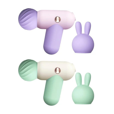 菁茉的配色非常溫柔 整體看起來像是少女心的小筋膜槍 個頭只有巴掌大小,攜帶會很方便。 兩個替換頭,一個是圓頭,一個是兔子頭。 兩側各有一個按鍵,分別控制震動端和吮吸端