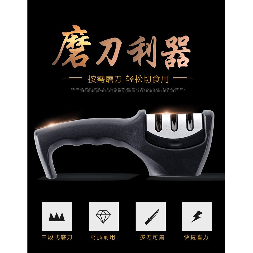 【特 點】:家用手磨刀器,三段式磨刀口,兼顧粗磨、細磨和精磨,按需磨刀,輕鬆切備料,加快廚房準備工作,適合多種刀具