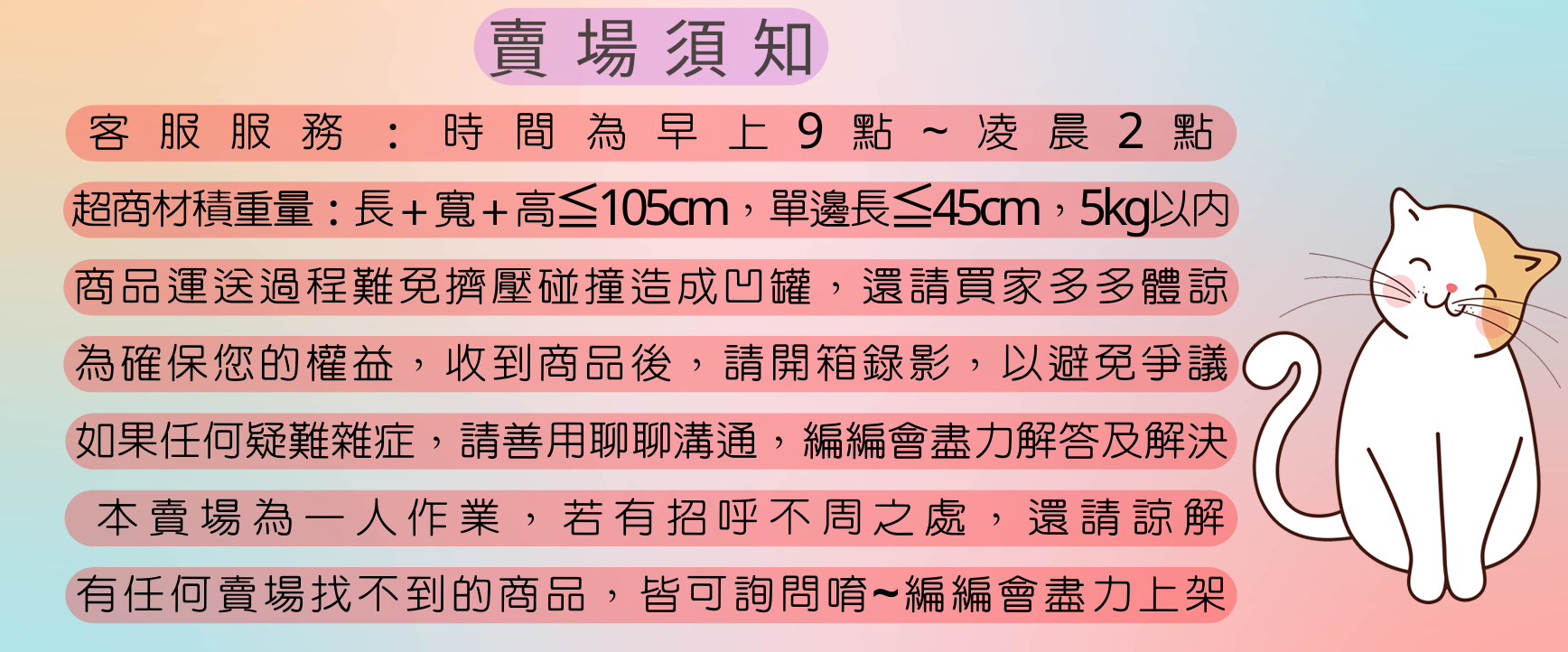 <p><span style="color:rgba(0,0,0,0.8)&#59;font-family:'Helvetica Neue', Helvetica, Arial, '文泉驛正黑', 'WenQuanYi Zen Hei', 'Hiragino Sans GB', '儷黑 Pro', 'LiHei Pro', 'Heiti TC', '微軟正黑體', 'Microsoft JhengHei UI', 'Microsoft JhengHei', sans-serif&#59;font-size:14px&#59;">🎀賣場須知🎀<br />🐶客服服務:時間為早上9點~凌晨2點<br />🐱超商材積重量:長+寬+高≦105cm,單邊長≦45cm,5kg以內<br />🐭商品運送過程難免擠壓碰撞造成凹罐,還請買家多多體諒<br />🐹為確保您的權益,收到商品後,請開箱錄影,以避免爭議<br />🐰如果任何疑難雜症,請善用聊聊溝通,編編會盡力解答及解決<br />🌈本賣場為一人作業,若有招呼不周之處,還請諒解<br />🐕有任何賣場找不到的商品,皆可詢問唷~編編會盡力上架🐈</span></p>