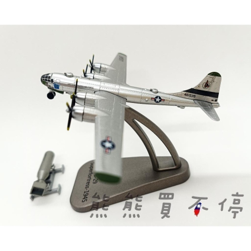 此款模型刻線明顯,塗裝講究,合金感不如AF1那台1/300的多,但多附了一顆核彈模型,很值得收藏!! 商品含合金展示底座,螺旋槳可轉動,其餘部位不可動。