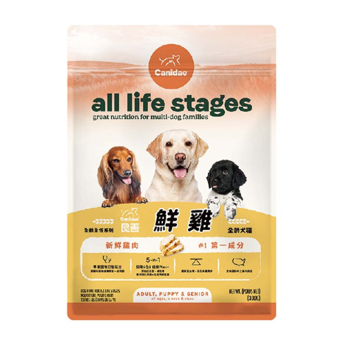 雞肉,雞肉粉,麥片,大麥,全麥高粱,小米,豌豆,豬肉粉,曬乾苜蓿粉,亞麻籽,乾酵母,雞油,鮭魚油,天然風味劑,蘇胺酸,鹽,氯化鉀,蛋白鋅,硫酸鋅,硫酸亞鐵,蛋白鐵,氯化膽鹼,牛磺酸,色氨酸,混合生育酚,維生素E補充劑,DL蛋胺酸,L抗壞血酸2多磷酸酯,菸鹼酸補充劑,硫酸銅,維生素A補充劑,蛋白銅,亞硒酸鈉,硫酸錳,蛋白錳,單硝酸硫胺素,d泛酸鈣,核黃素補充劑,鹽酸吡哆醇維生素B6,乾燥嗜酸乳桿菌發酵產物,維生素B12補充劑,碘酸鈣,葉酸,維生素D3補充劑,生物素,乾燥乾酪乳桿菌發酵產物,綠茶萃取物,迷迭香萃取物