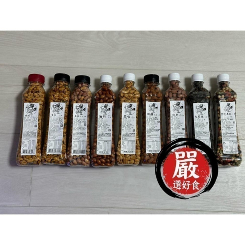 五香花生(全素) 成份:花生、五香香料(肉桂、八角、丁香、陳皮、茴香、甘草、花椒、白胡椒)、鹽、維他命E(抗氧化劑)、甜味劑(醋磺內酯鉀) 淨重:300公克±3% 蒜香花生 成份:花生、大豆油鹽、蒜、鹽、維他命E(抗氧化劑)
