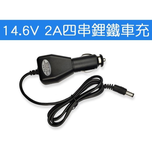 有了這顆『鋰鐵電池車充』 您就可以用汽車點菸孔幫 電池充電了,真的很方便。 產品規格: 【品名】14.6V 2A 四串鋰鐵電池車充 【輸入】DC 10~14V 【輸入插頭規格】點菸插頭(車充頭) 【輸出】DC 14.6V 2A 【輸出插頭規格】DC5.5x2.1mm(公插頭) 【輸出線長】115cm 【指示燈】充電中亮紅燈、充飽電亮綠燈 【尺寸】9.0 x4.0 x3.0 cm 【重量】60g +/-10% 【功能】充滿自停、過熱保護、過壓保護、安全靜音 溫聲提醒: 可充賣場內『高安全性12V 6.4AH小型鋰鐵電池』(圖3),約4小時可以充飽電。 商品連結:https://shopee.tw/product/2716694/7741793938/