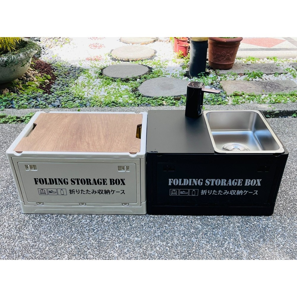 2️⃣、折疊箱四面開蓋設計,方便收納小物及裝卸水桶。底部有輪子方便水槽移動。
