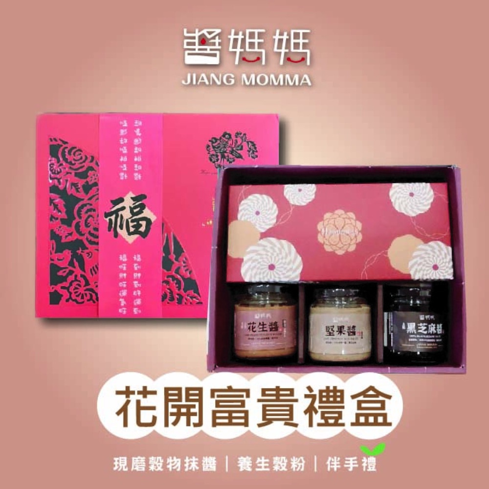 [醬媽媽芝麻醬] 花開富貴禮盒🎁 花生醬+白芝麻醬+黑芝麻醬+綜合芝麻糕 年節伴手禮盒 春節禮品 附贈提袋
