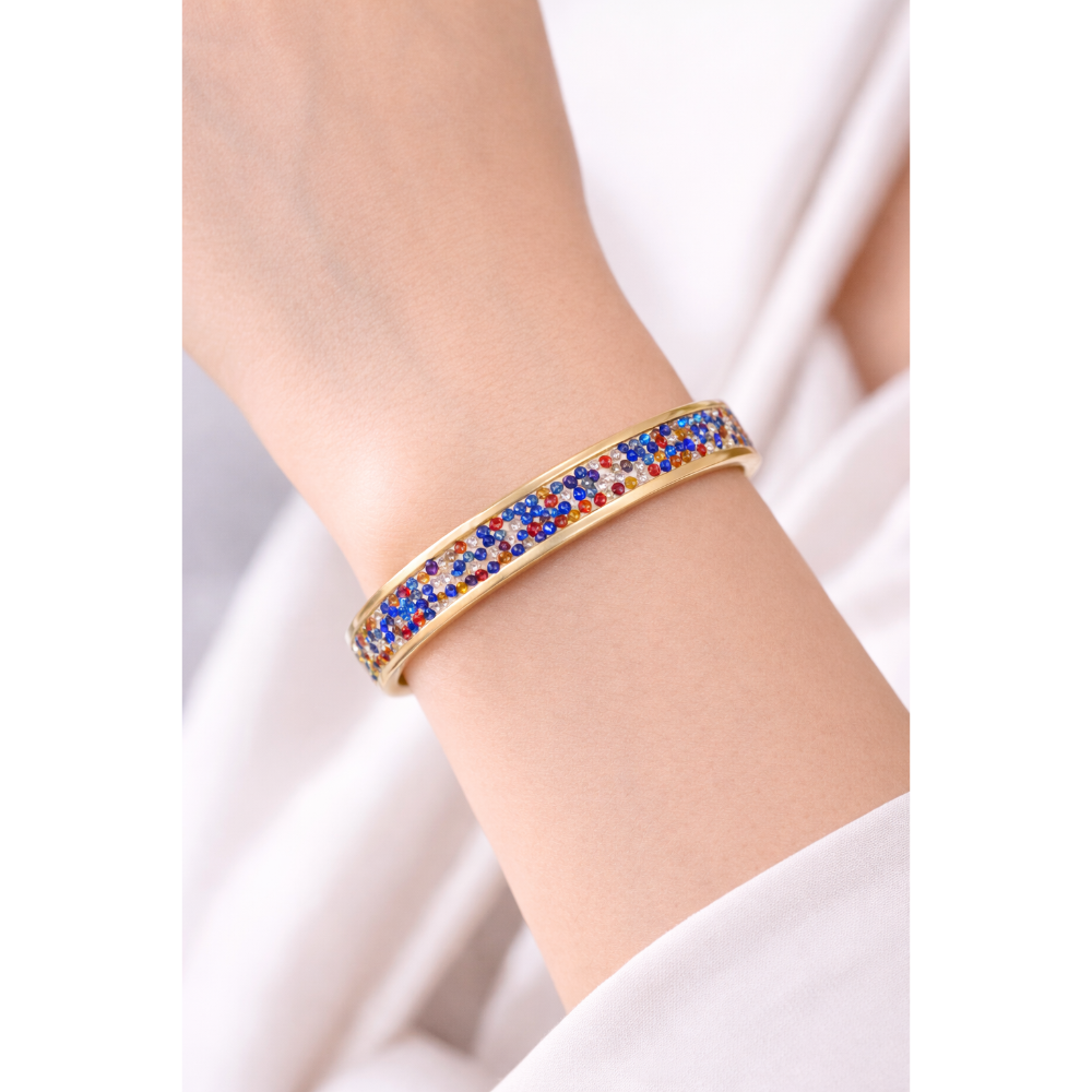 以彩色鑲鑽方式,鋪滿手環上 增加手環的華麗,絢麗感,手環偏寬,手圍細的人請斟酌購買