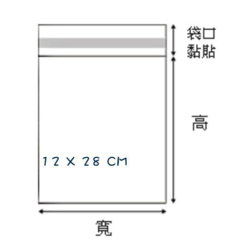 <4-0120-28> ★規格 :12*28cm (可裝內容物的尺寸,不含自粘部份) ★厚度 :0.03mm ★包裝 :包/100入+-2% ★單位 :包 ★用途 :包裝、收納、美化 ★MIT 透亮新晰 ★可直接碰觸食品★