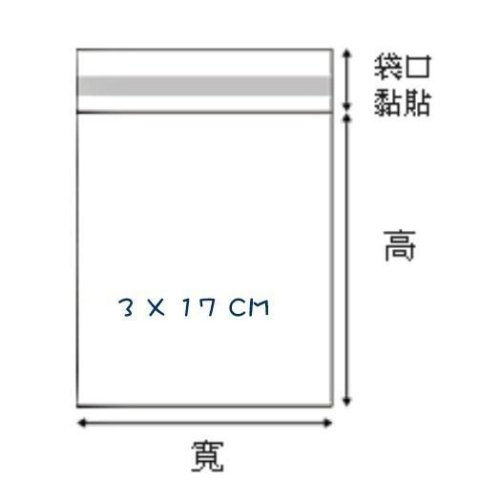 <4-0030-17> ★規格 :3*17cm (可裝內容物的尺寸,不含自粘部份) ★厚度 :0.03mm ★包裝 :包/100入+-2% ★單位 :包 ★用途 :包裝、收納、美化 ★MIT 透亮新晰 ★可直接碰觸食品★