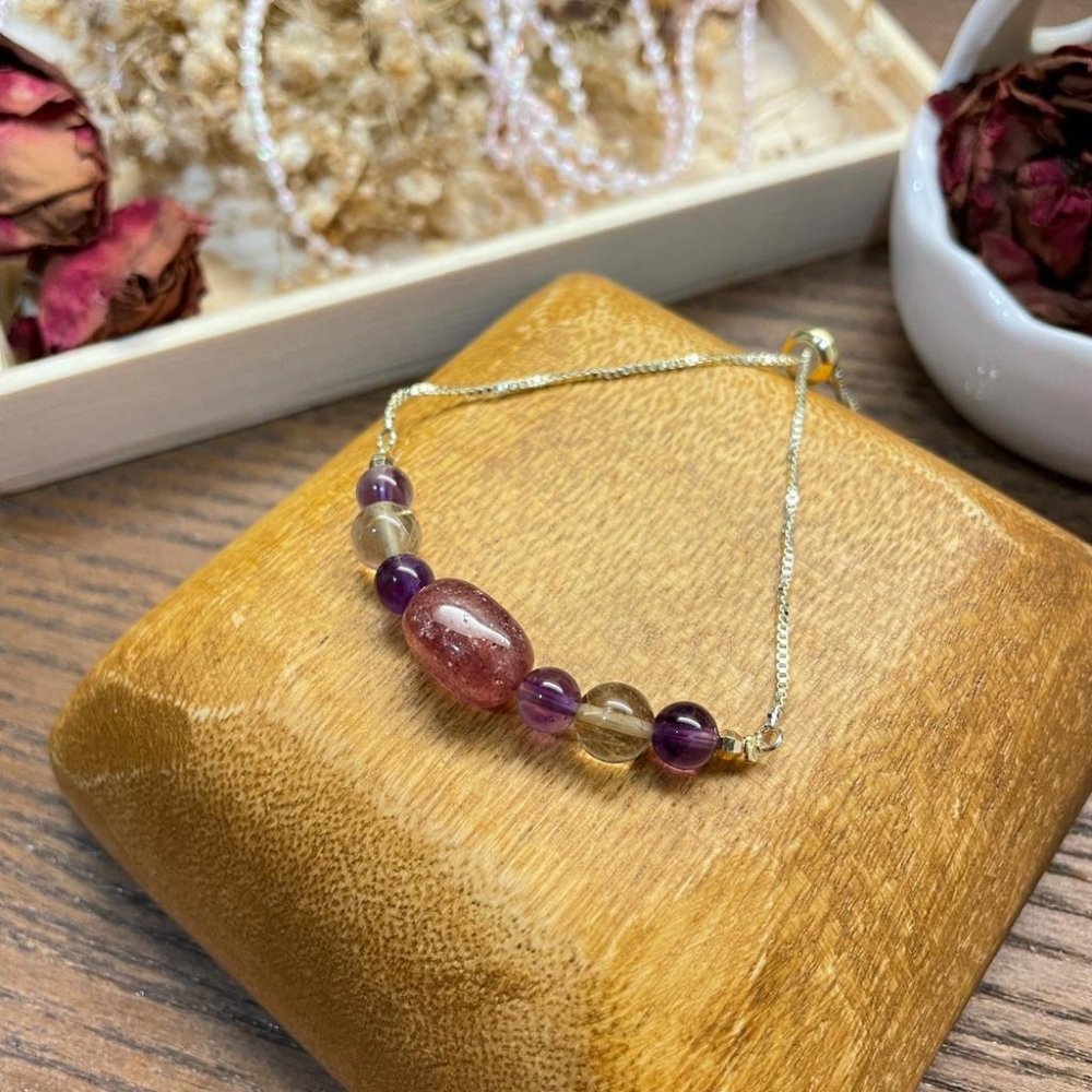 『珍視』紅草莓晶+黃水晶+紫水晶,水晶手鍊,設計款文創手作,注金|元元圓滾滾