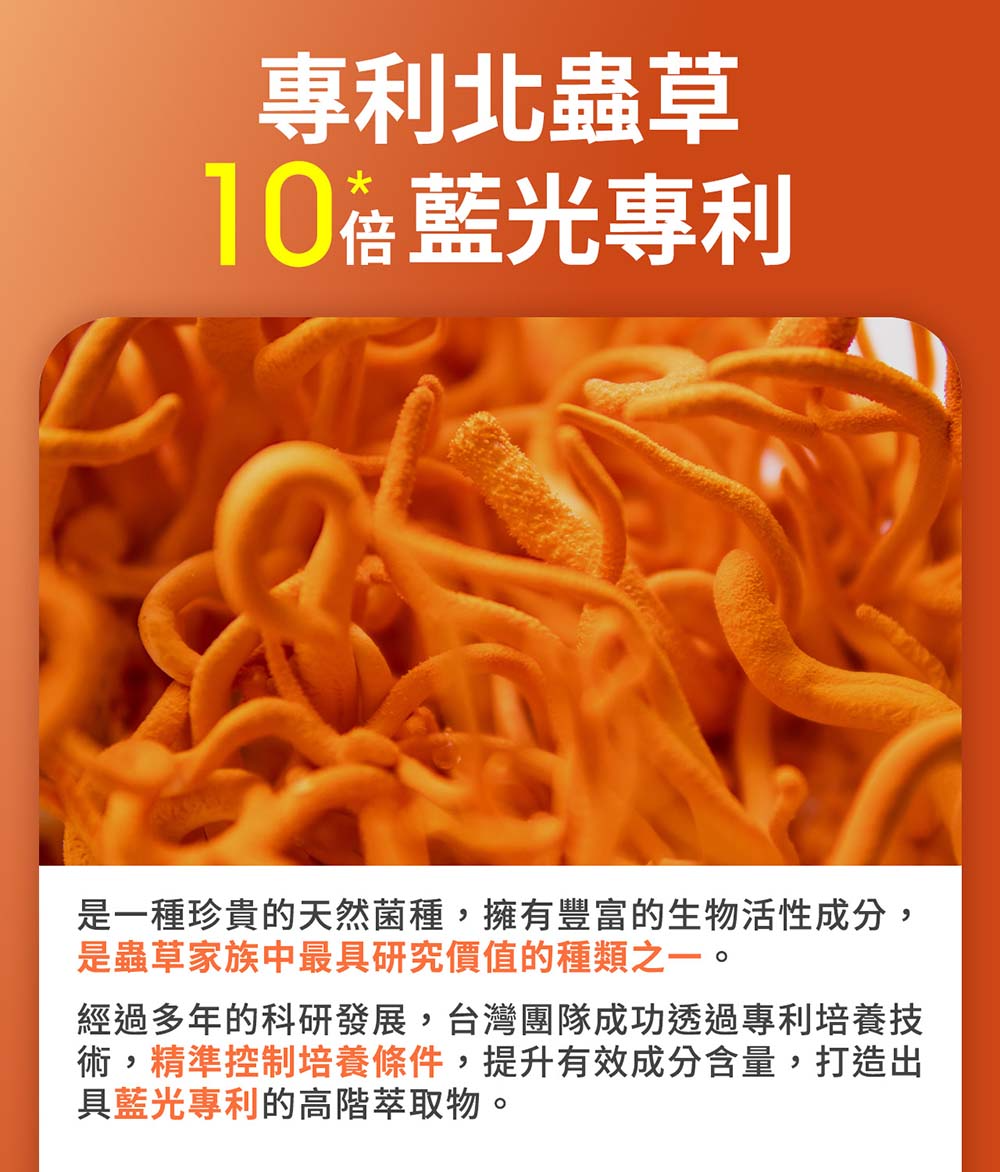 2.本產品含蛹蟲草菌絲體萃取物,不建議嬰幼兒、兒童、孕婦與真菌過敏者使用。