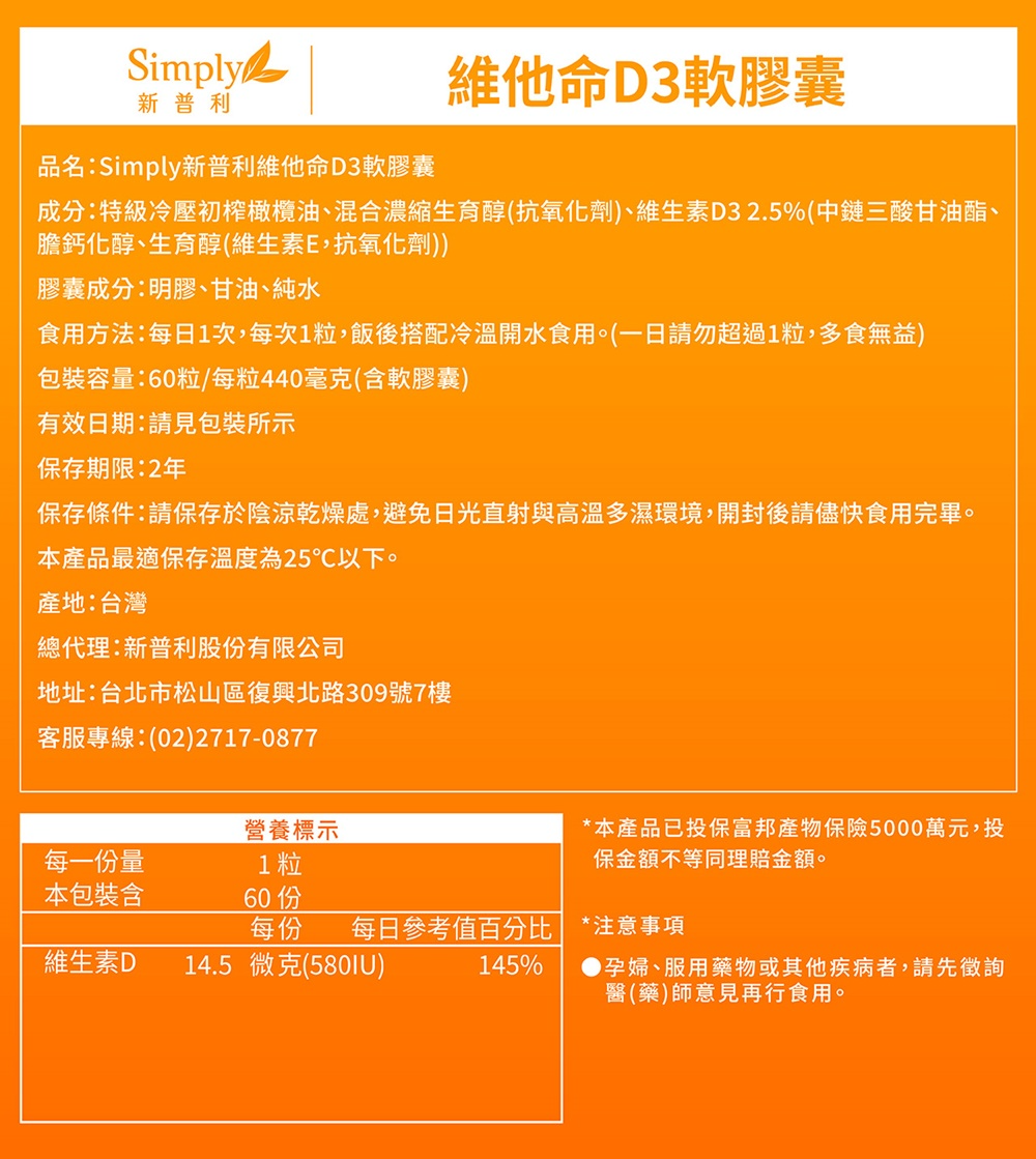 商品品名:【Simply新普利】 維他命D軟膠囊 60顆