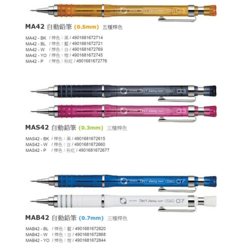 ●MA42(0.5mm)筆桿5色: 黑、藍、粉紅、橙、白