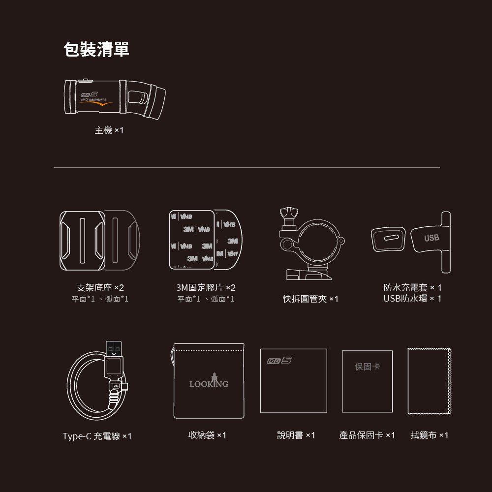 🔒6.配件:DB5主機、1.5m充電線、防水充電套、快拆防震支架、收納袋、拭鏡布