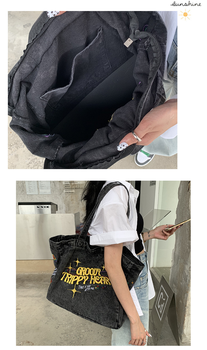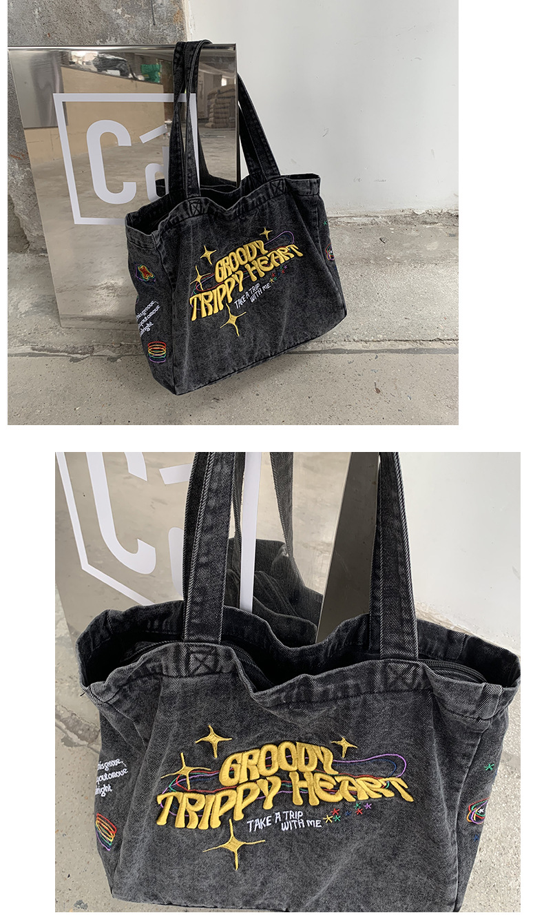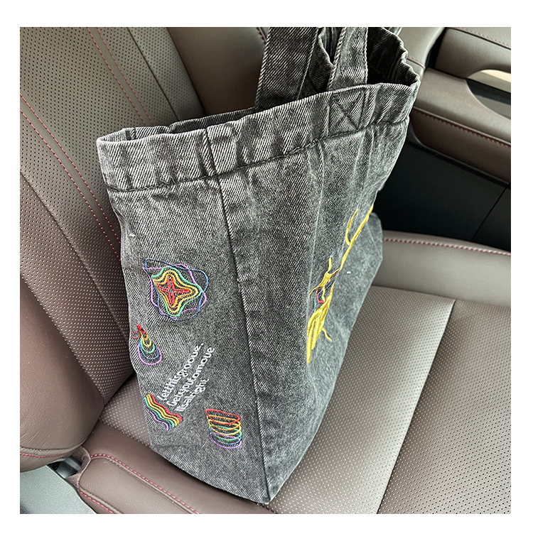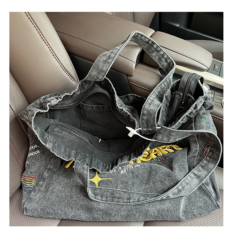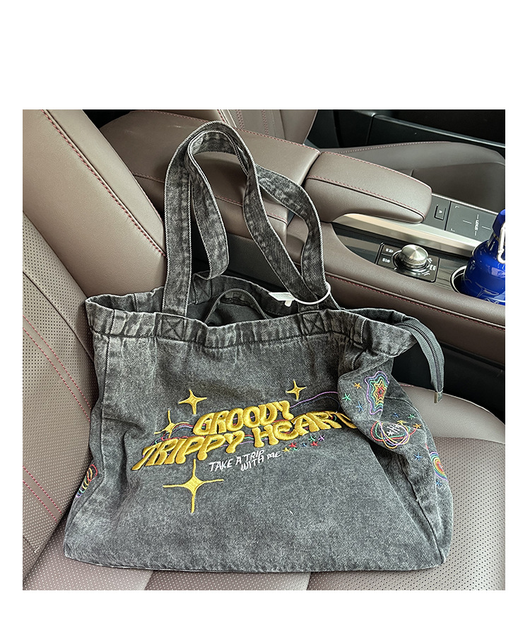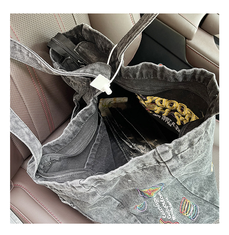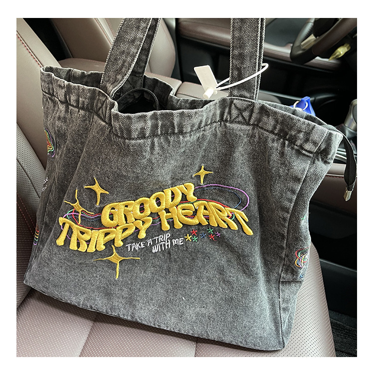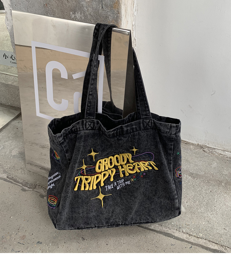 ✔美式街頭風字母刺繡牛仔單肩托特包