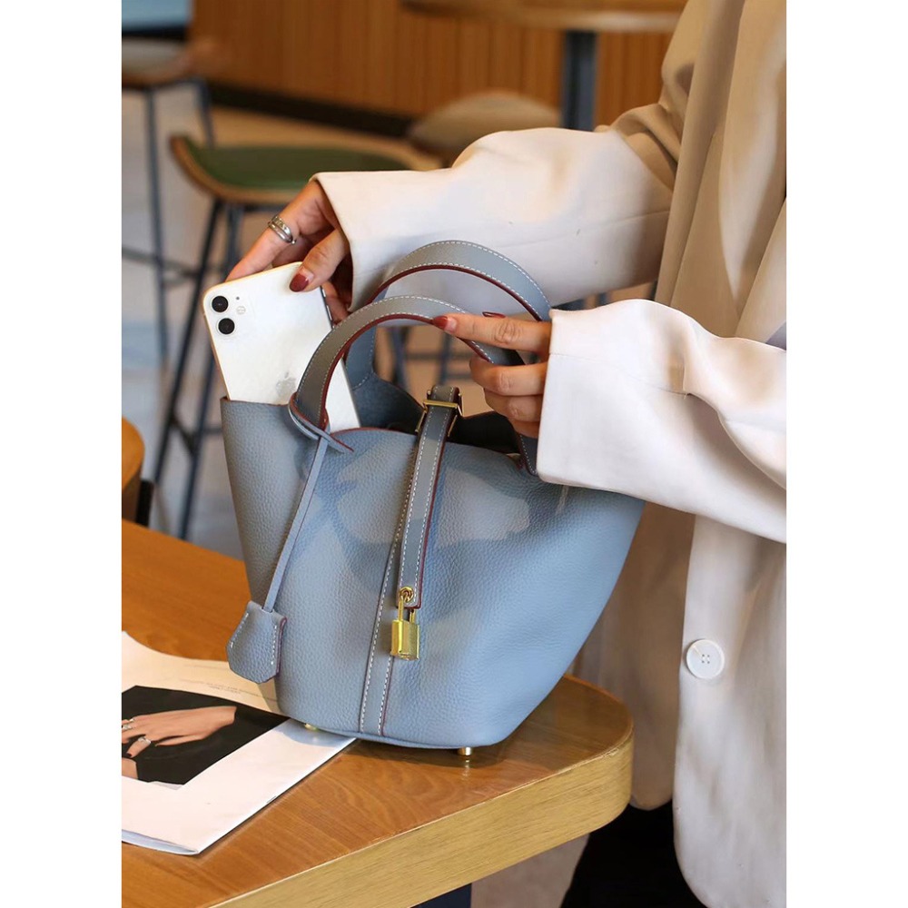 【生活好室】韓版鎖扣子母水桶包 女生包包 手拿包 真皮材質 荔枝牛皮 手提包 肩背包 女生斜背包 小水桶包