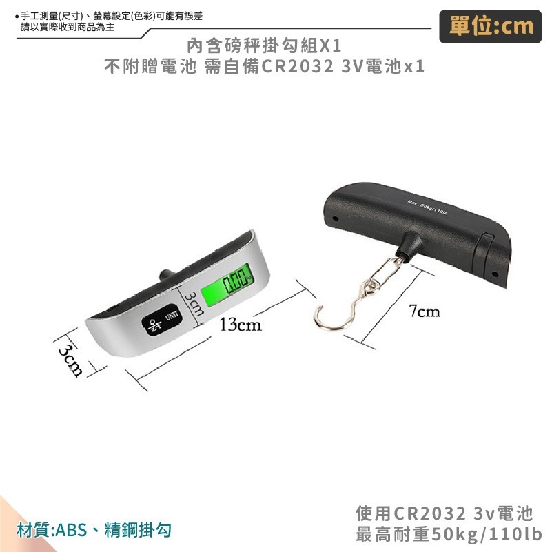 使用CR2032 3V電池x1(需自備),測量物須高於10g,最高耐重50kg/110lb