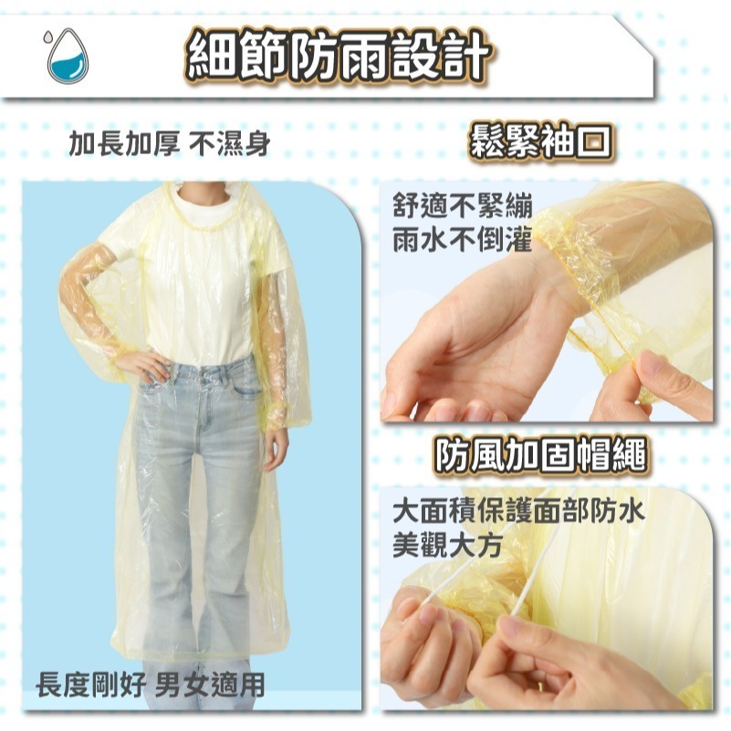 • 全身防護:雨衣設計覆蓋全身,提供全方位的防護,避免雨水滲透。